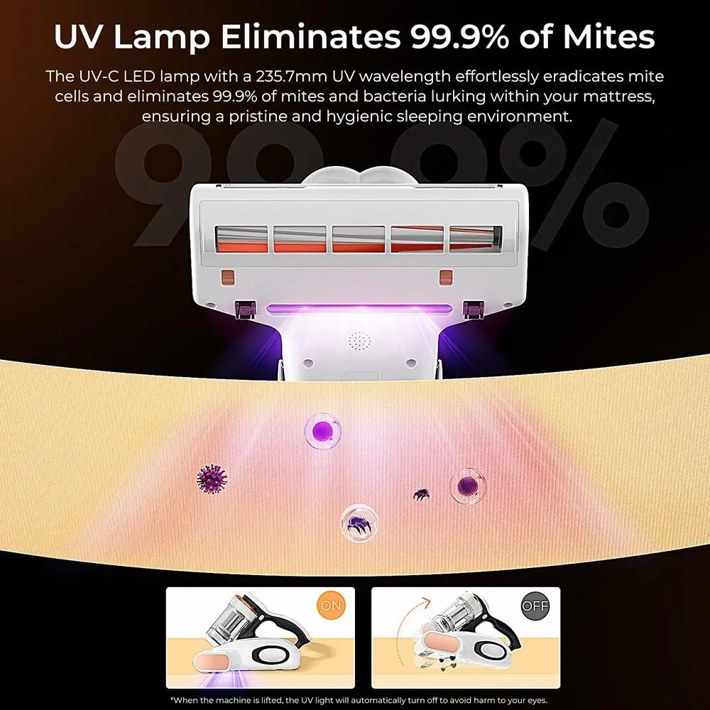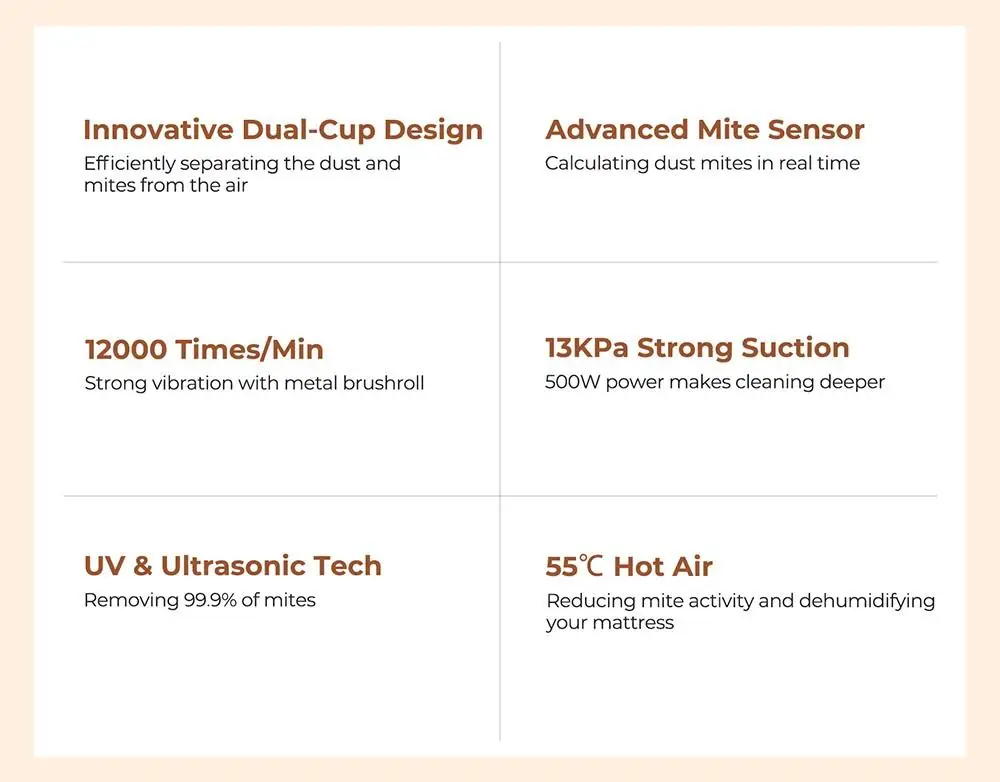 Rated Voltage: 220V-240V, 50/60Hz Rated Power: 500W Motor: Double Suction: 13KPa Capacity of Dust Cup: 0.38L Length of Power Cord: 5m Hot Wind Temperature: 55°C Working Noise: ≤76dB Dust Mite Sensor: Yes Removal of Mites and Bacteria: ≥99.9% Functions: Pat, Sterilize, Ultrasonic, Dry |