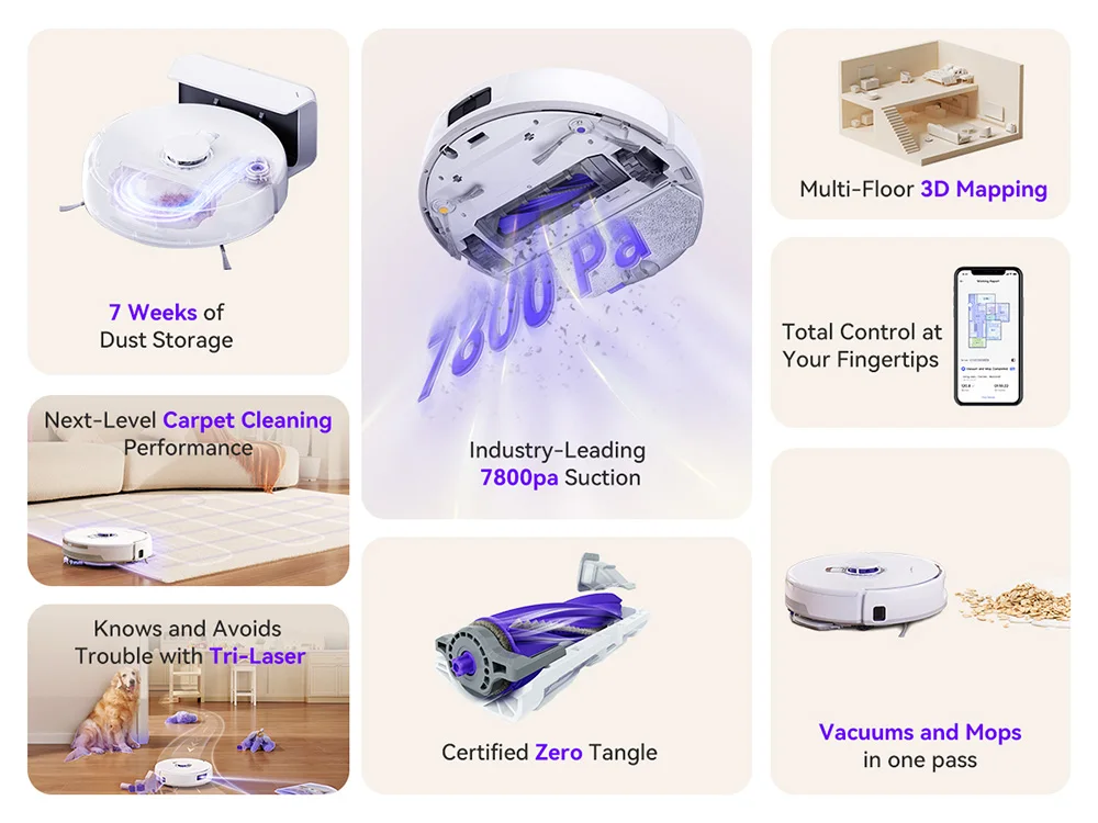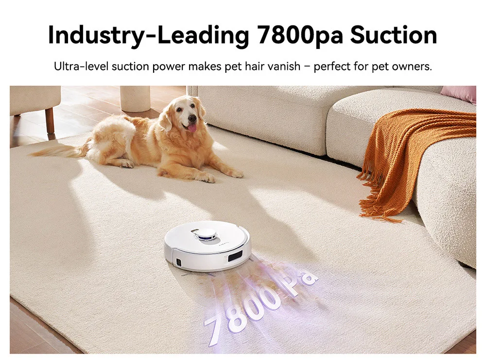1. Ultra silný sací výkon 7800 Pa odstraňuje zvířecí chlupy – ideální pro majitele domácích mazlíčků.
