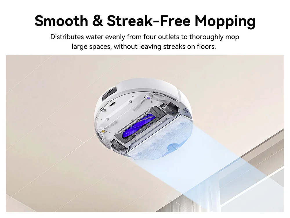 8. Hladké vytírání bez šmouh rovnoměrně rozděluje vodu ze čtyř vývodů a důkladně vytírá velké prostory bez zanechávání šmouh na podlaze.