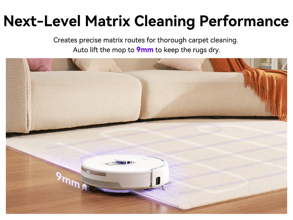 3. Čisticí systém Matrix na vyšší úrovni vytváří přesné trasy pro důkladné čištění koberců. Automatické zvedání mopu na 9 mm udrží koberce suché.