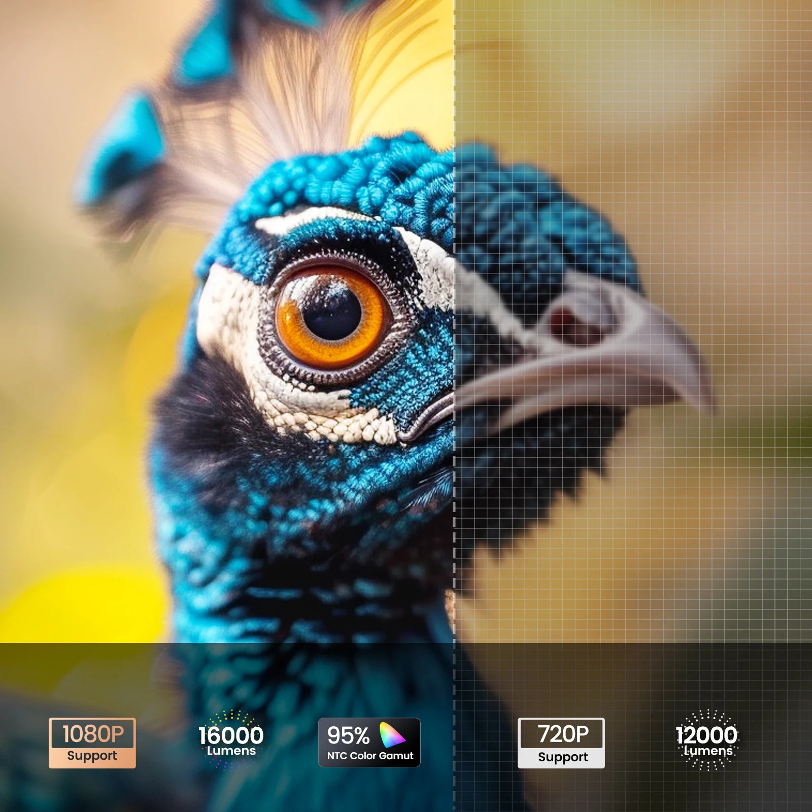 【Projektor podporuje rozlišení 1080P s nejnovější technologií】Tento mini projektor využívá nejnovější barevnou technologii NTSC s nejpokročilejším čipem pro zpracování jasu a technologií odvodu tepla, která zvyšuje lumeny na 16000L, má vylepšený kontrastní poměr 20000:1, zajišťuje vynikající kvalitu obrazu a živější barvy a umožňuje vám zažít film jako v kině na velkém plátně o úhlopříčce 40 až 250 palců (doporučená projekční vzdálenost 1,5–4 m).