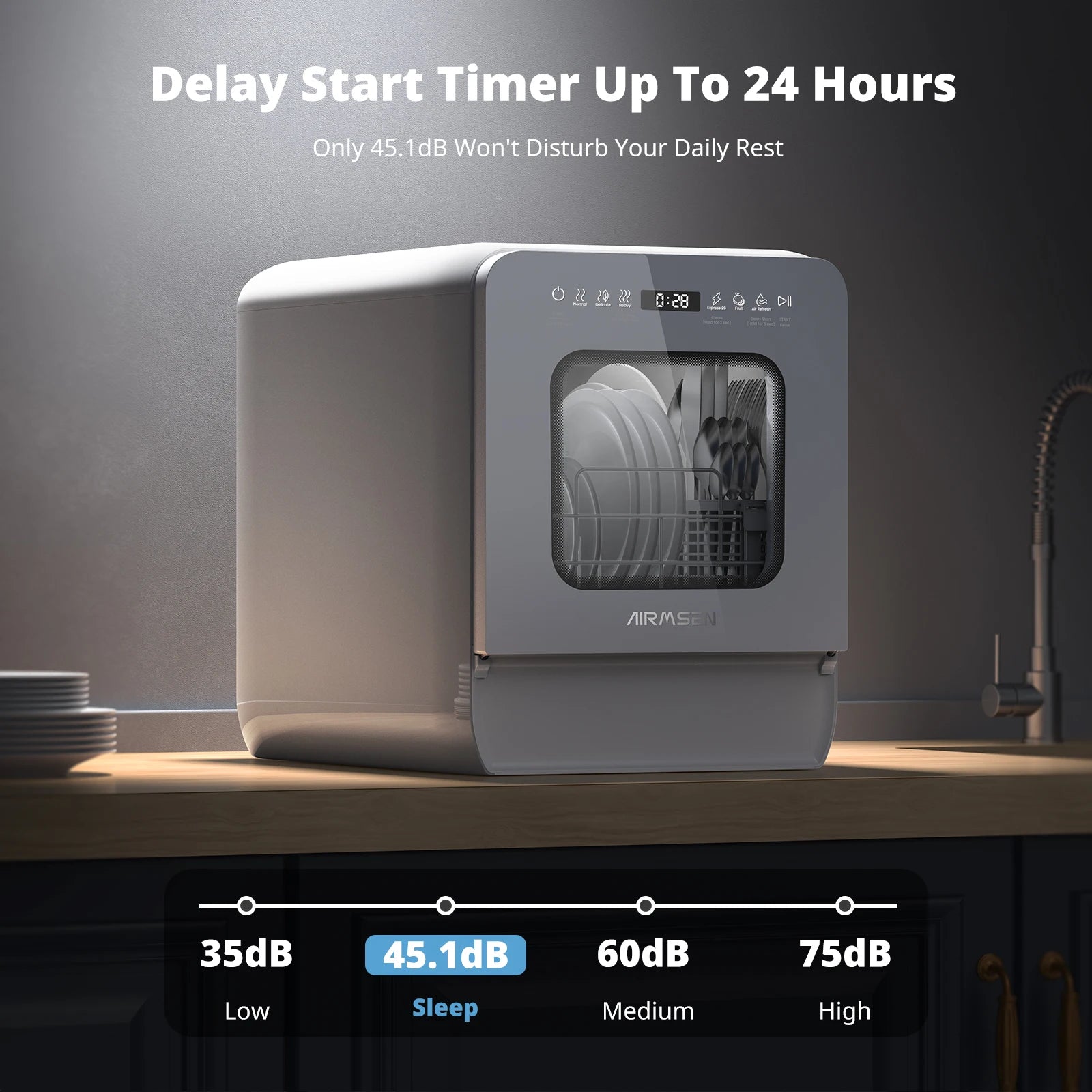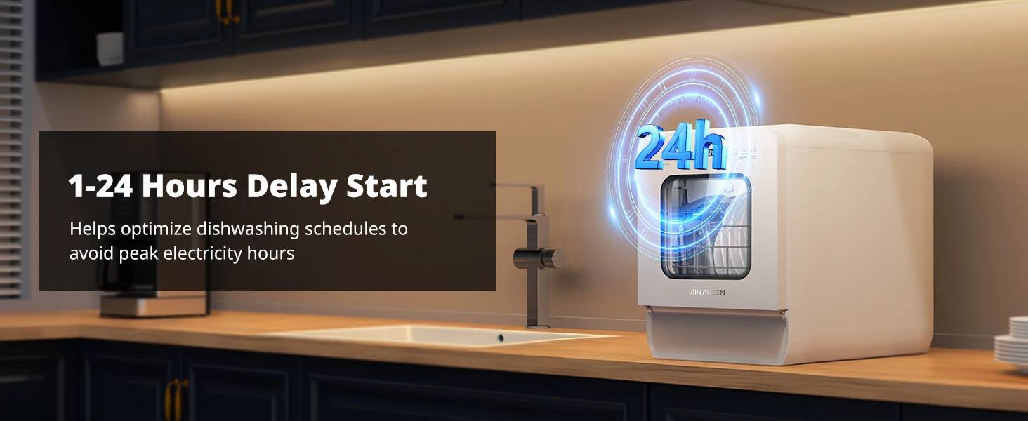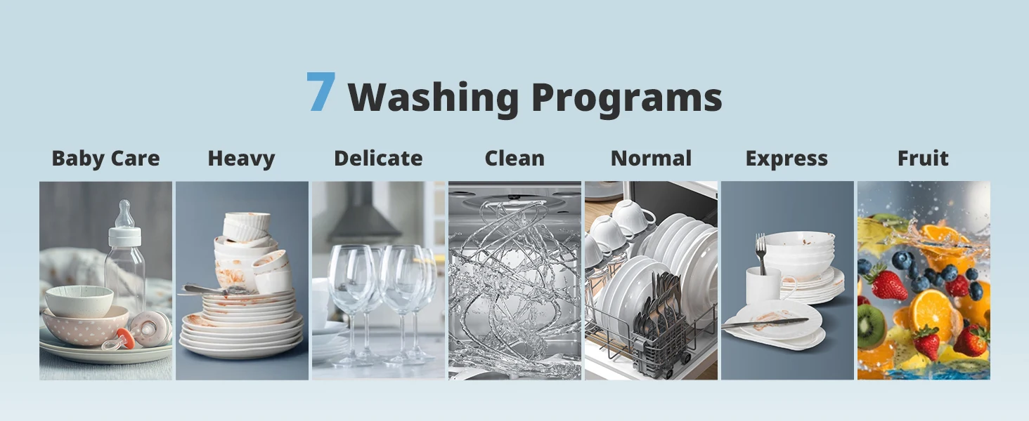 【7+2 erweiterte Spülprogramme】Dieser Tischgeschirrspüler bietet 7 vielseitige Spülprogramme: Babypflege, Öko-Spülung, Intensivspülung, Reinigung, Standard, Schnell und Obstmodus. Diese Programme wechseln zwischen kaltem und heißem Wasser für optimale Reinigungsergebnisse. Darüber hinaus gibt es 2 erweiterte Programme: 1–24 Stunden Startverzögerung und Auto-Reinigungsmodus, mit denen Sie Ihren Spülplan für verbesserte Energieeffizienz und reduzierte Geräuschentwicklung anpassen können.
