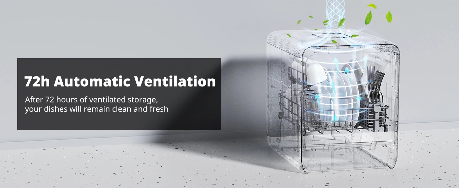 【Lufterfrischungsfunktion】 Dieser Geschirrspüler verfügt über eine 60-minütige Hochtemperaturtrocknung und eine 72-stündige automatische Belüftung, wodurch sichergestellt wird, dass sowohl das Geschirr als auch die Maschine im Laufe der Zeit trocken, frisch und geruchsfrei bleiben. Diese Funktion kann mit jedem Spülprogramm außer dem Obstmodus verwendet oder unabhängig davon betrieben werden.