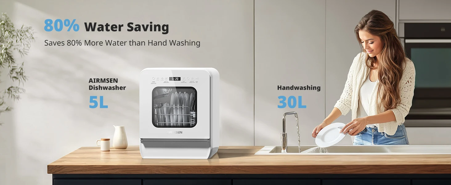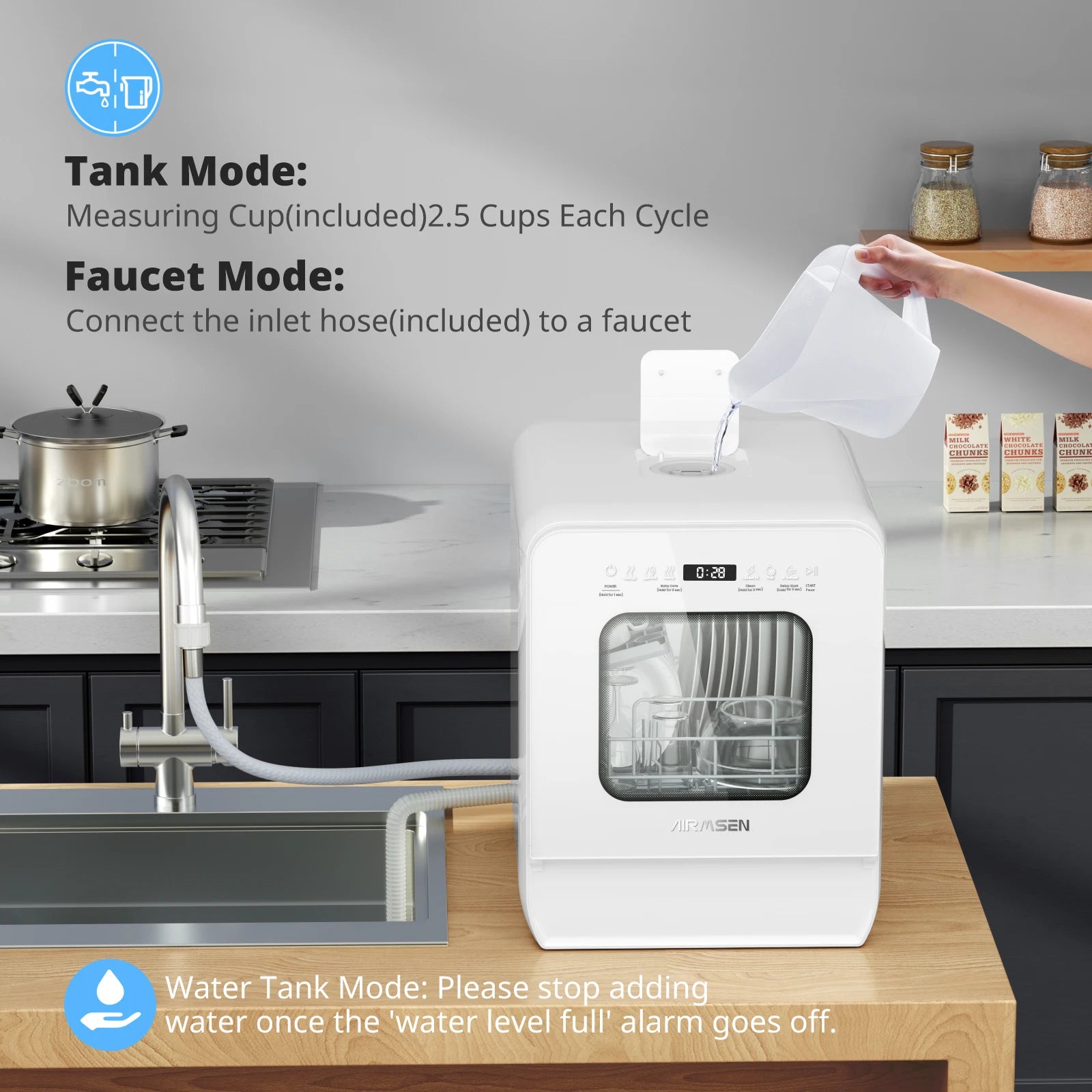 【Zwei Wasserversorgungsmodi】 Dieser Geschirrspüler bietet zwei Wasserversorgungsoptionen: Wasserhahnmodus und Tankmodus. Der eingebaute 5-Liter-Wassertank sorgt für Komfort auch ohne Spüle in der Nähe. Die Wasserstandsanzeige benachrichtigt Sie automatisch, wenn der Tank den richtigen Füllstand erreicht hat. Ein Wasserschlauch für den direkten Anschluss an einen Küchenhahn ist im Lieferumfang enthalten (Adapter erforderlich).