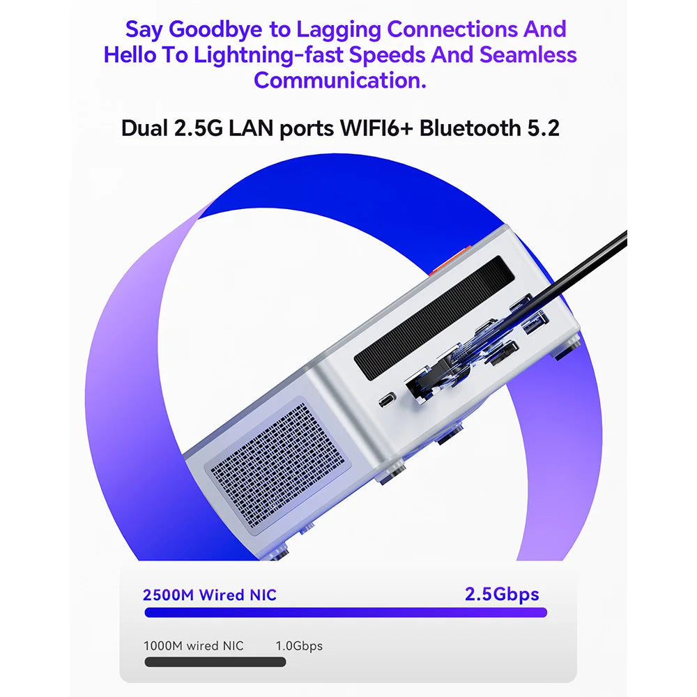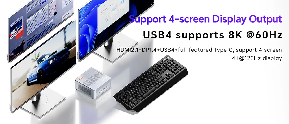 HDMI 2.1 + Typ-C + USB 4 + DP1.4 unterstützen 4 Bildschirme mit bis zu 8K-Anzeige. Der Minicomputer GEM12 Max verfügt außerdem über 2 x 2,5G-LAN-Anschlüsse, 2 x USB 3.2, 2 x USB 2.0 und eine 3,5-mm-Standardkopfhörerbuchse sowie integriertes WLAN 6 und Bluetooth 5.2-Funktechnologie, wodurch er mit verschiedenen Peripheriegeräten kompatibel ist und Sie verschiedene Anwendungsszenarien besser bewältigen können.