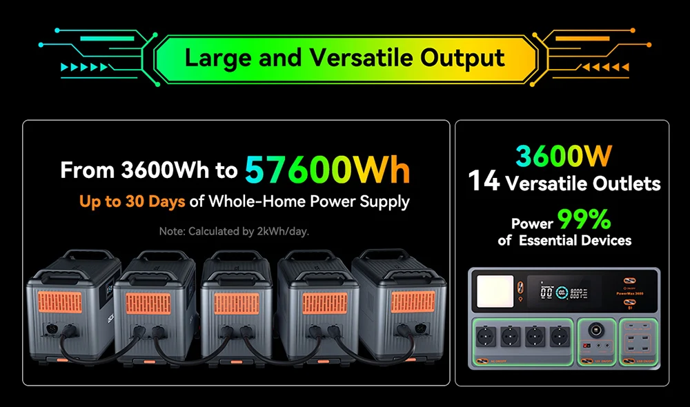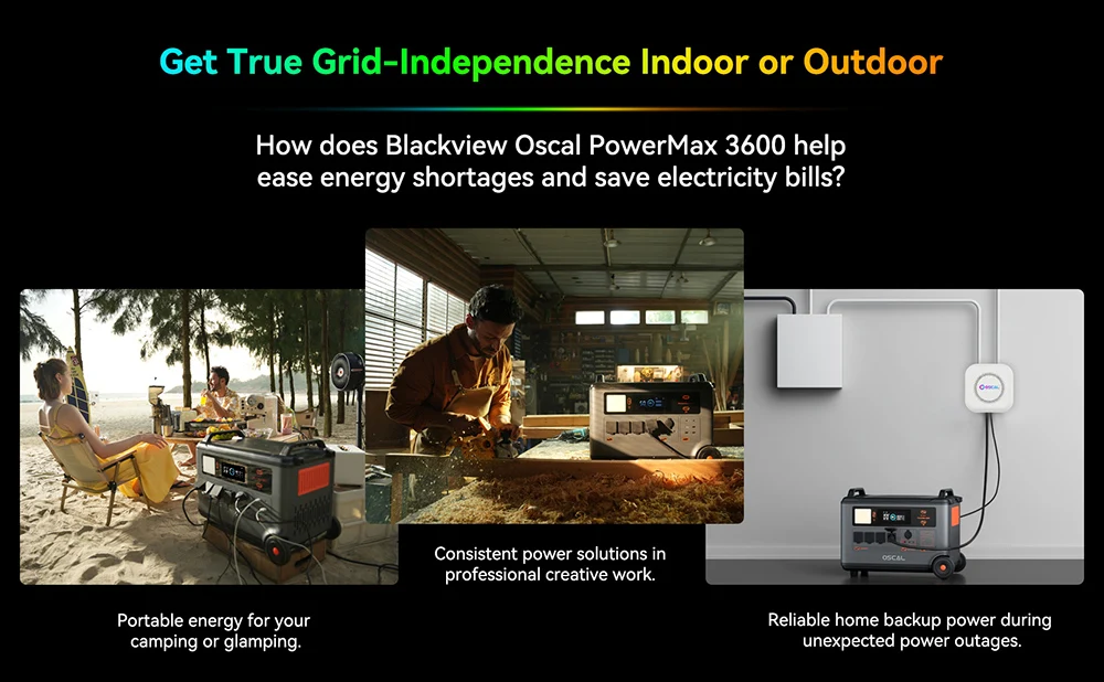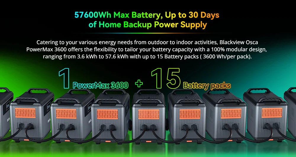 Blackview Oscal PowerMax 3600 deckt Ihren unterschiedlichen Energiebedarf bei Outdoor- und Indoor-Aktivitäten ab und bietet Ihnen die Flexibilität, Ihre Akkukapazität mit einem 100 % modularen Design individuell anzupassen. Es reicht von 3,6 kWh bis 57,6 kWh mit bis zu 15 Akkupacks (3600 Wh/pro Pack).