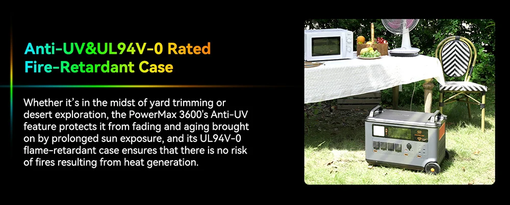 Ob beim Trimmen des Gartens oder bei der Erkundung der Wüste: Die Anti-UV-Funktion des PowerMax 3600 schützt ihn vor dem Ausbleichen und Altern durch längere Sonneneinstrahlung und sein flammhemmendes Gehäuse gemäß UL94V-0 stellt sicher, dass keine Brandgefahr durch Hitzeentwicklung besteht.