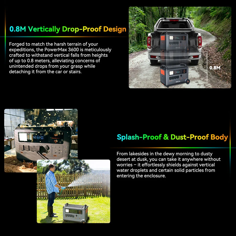 Der PowerMax 3600 wurde speziell für das raue Gelände Ihrer Expeditionen entwickelt und ist sorgfältig gefertigt, um Stürzen aus bis zu 0,8 Metern Höhe standzuhalten. So müssen Sie sich keine Sorgen machen, dass er Ihnen beim Abnehmen vom Auto oder von der Treppe versehentlich aus der Hand fällt.